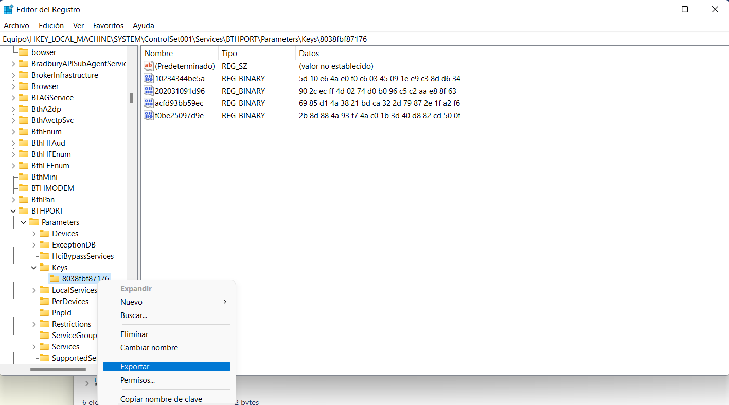 En el editor del registro buscaremos la entrada HKEY_LOCAL_MACHINE\SYSTEM\CurrentControlSet\Services\BTHPORT\Parameters\Keys\, haremos click derecho sobre ella y exportaremos las claves Bluetooth almacenadas.