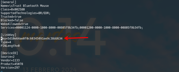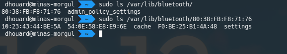 Ya en GNU/Linux, veremos que el contenido del directorio /var/lib/bluetooth contiene un subdirectorio cuyo nombre coincide con la MAC de nuestro receptor bluetooth y dentro de él, se encontrarán, de la misma manera, un subdirectorio identificado por la MAC de cada uno de los dispositivos emparejados.