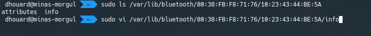 Buscamos cuál es el directorio de nuestro ratón con la instrucción <bluetoothctl devices> y editamos el fichero «info» correspondiente a la MAC de nuestro ratón.